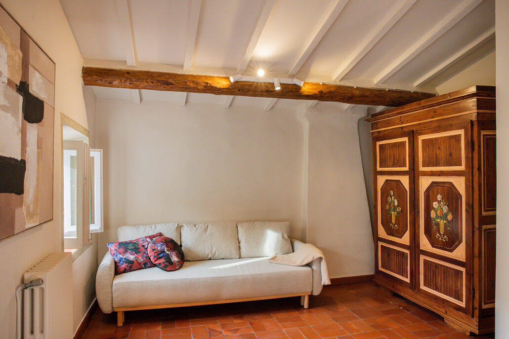 Entering, you notice the elegance that distinguishes the house: looking up you can see the beams and decorative ornaments on the ceiling; a large fireplace will welcome you in the living room. Crossed the first threshold on the right side we find a TV area and a refined dining table. The kitchen is not very large, but it has everything you need, from the oven to the stove, from the coffee machine to the kettle. Between the kitchen and the living area, there is also a small bathroom.